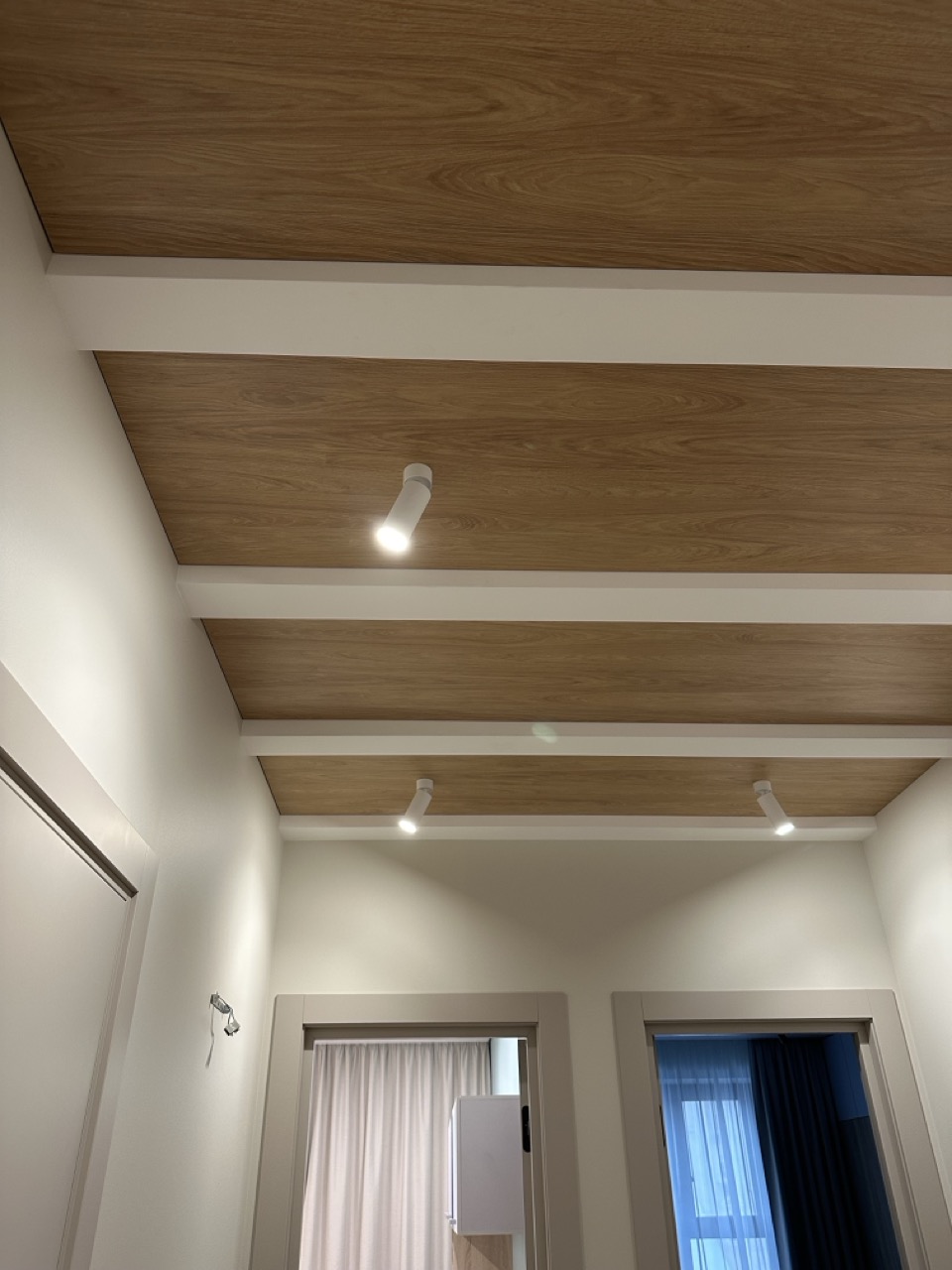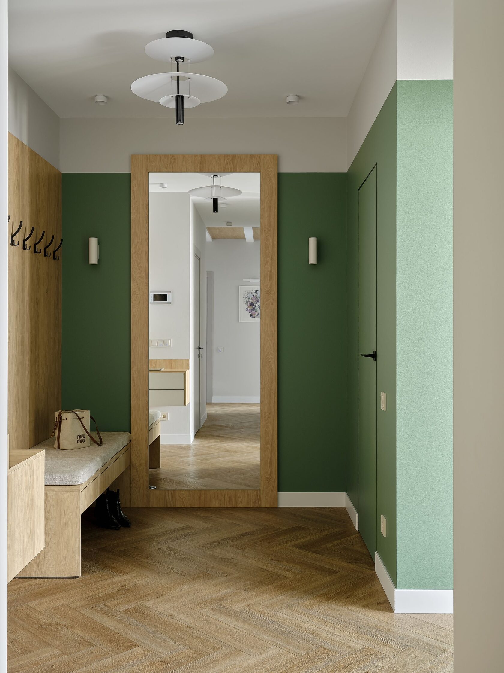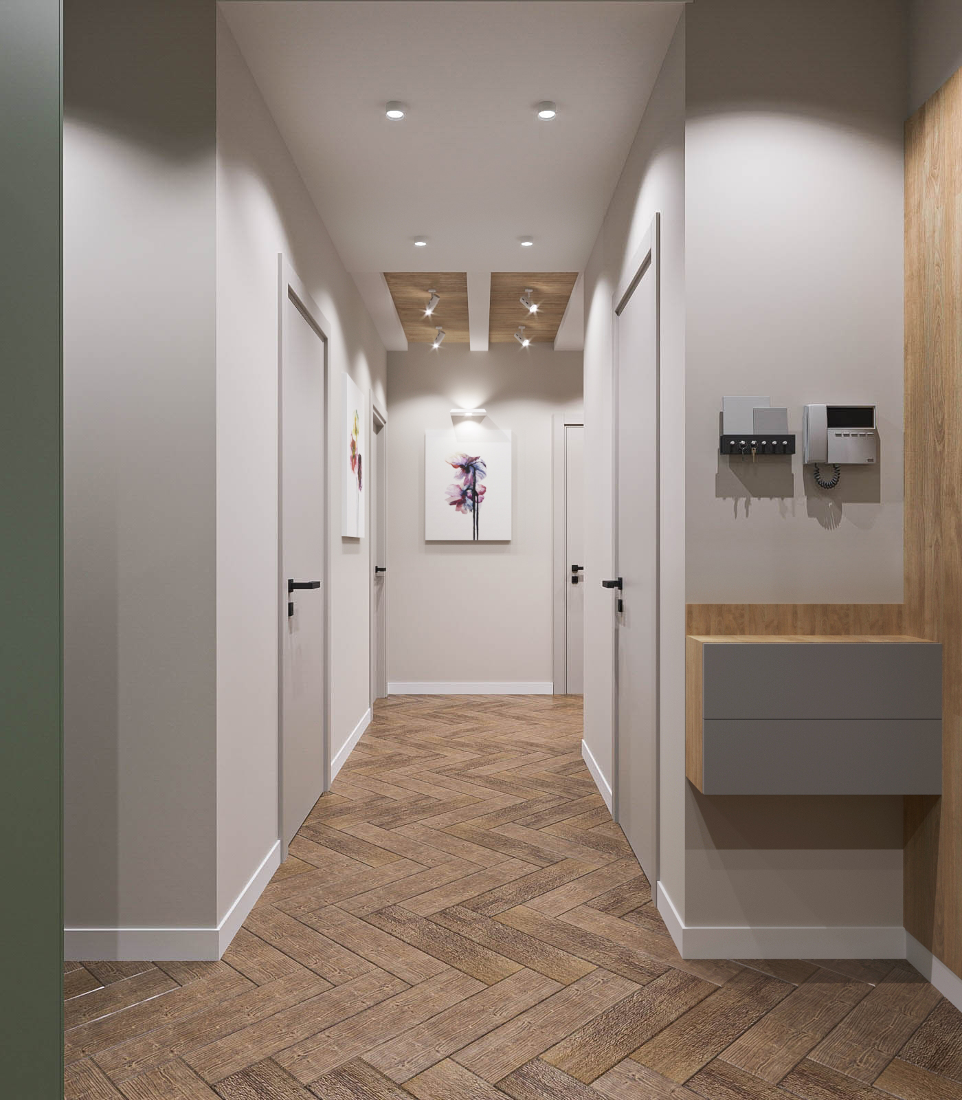 Любовь заказчиков к загородной жизни вдохновила нас на тёплые детали: в коридоре появились уютные балки на потолке и стилизация под деревянные панели.