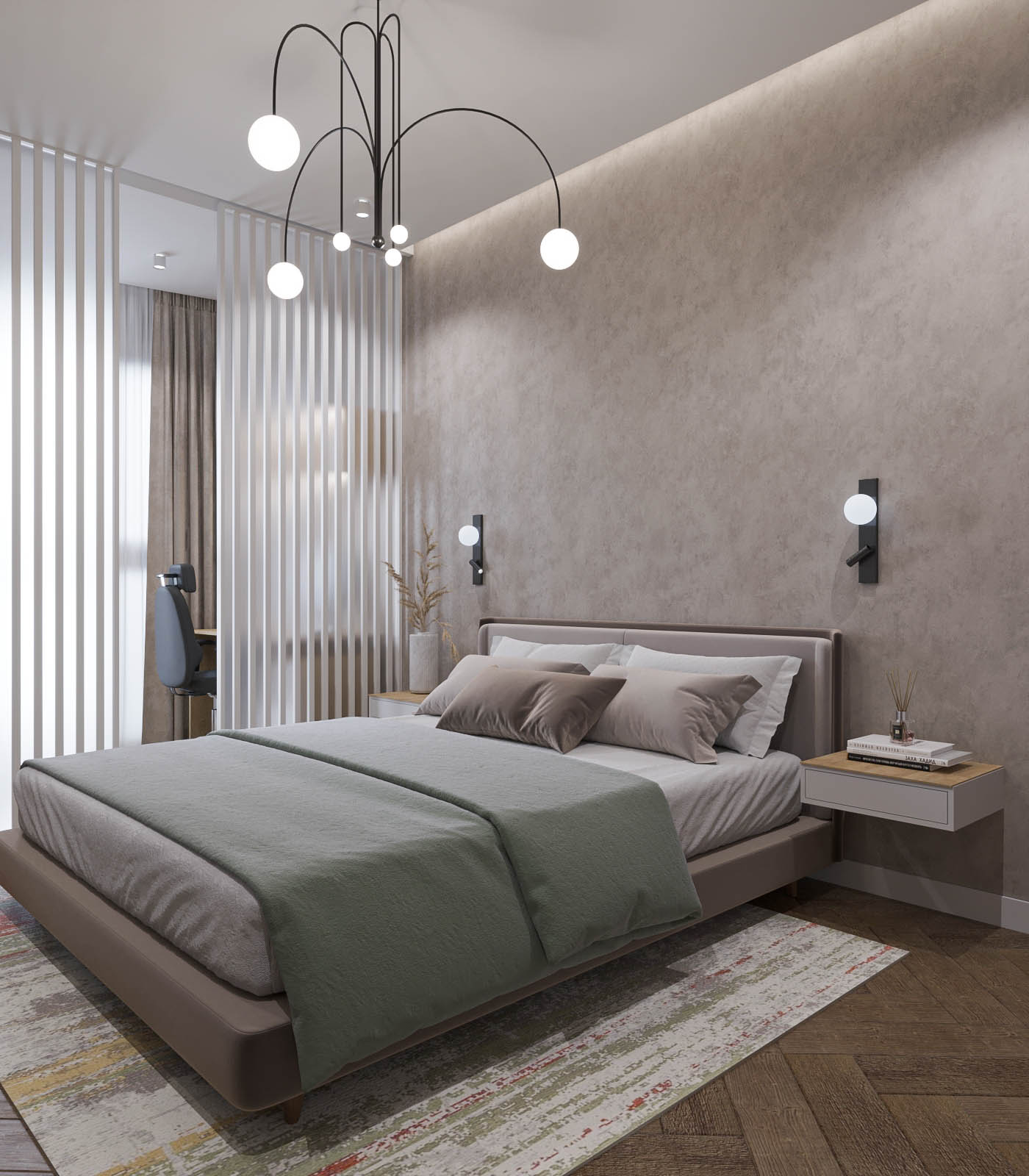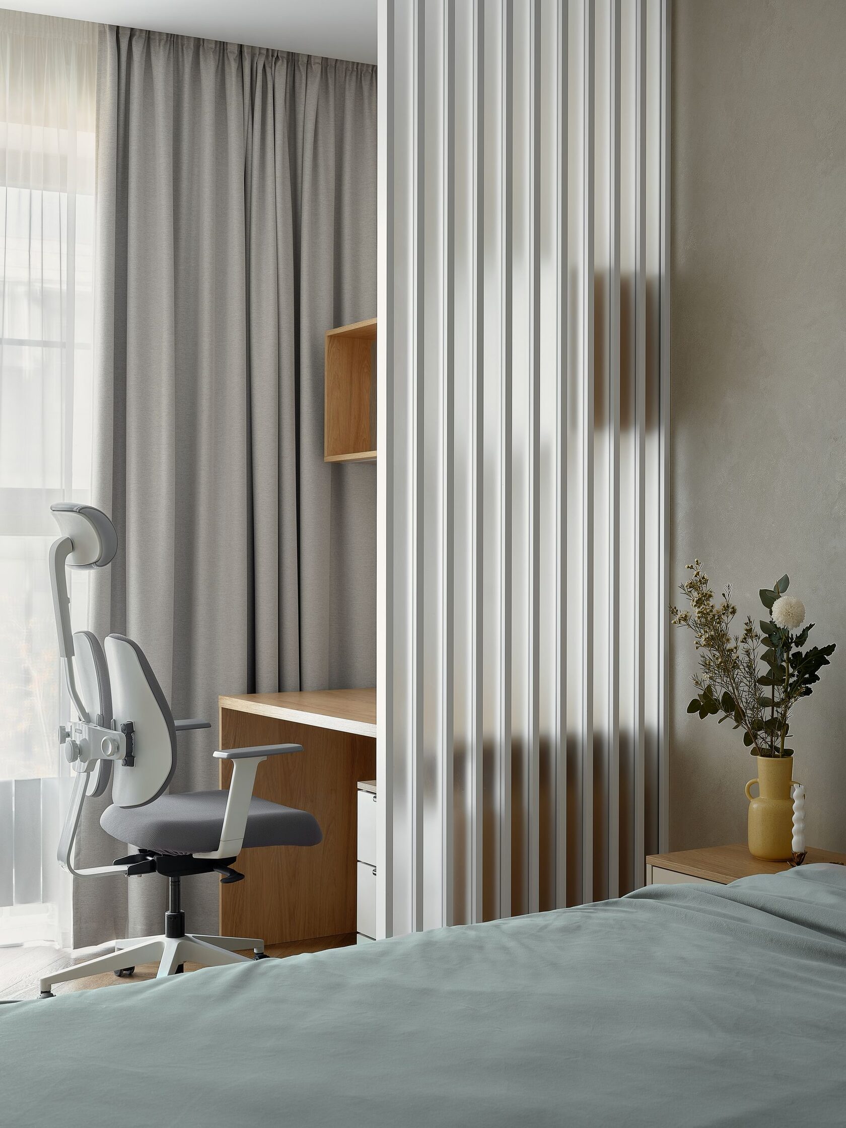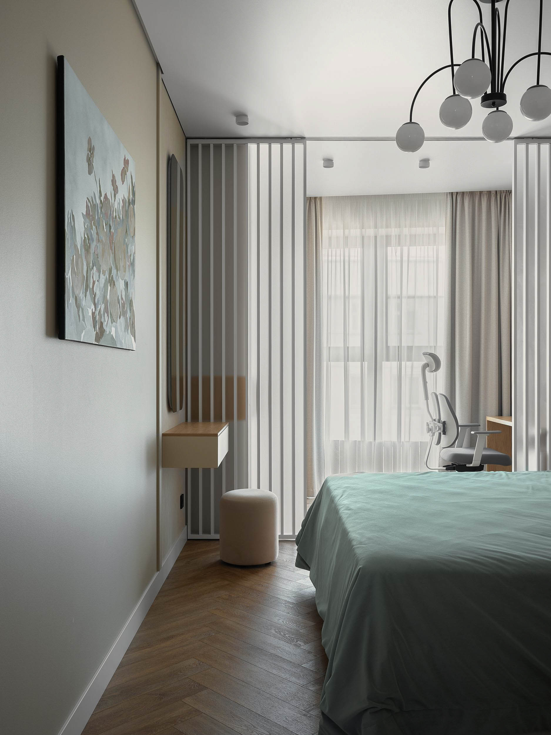 Планировочное решение стало для нас увлекательной задачей, ведь необходимо было учесть несколько ключевых критериев: организовать удобные системы хранения, выделить рабочую зону в спальне и найти место для хозяйственной комнаты.