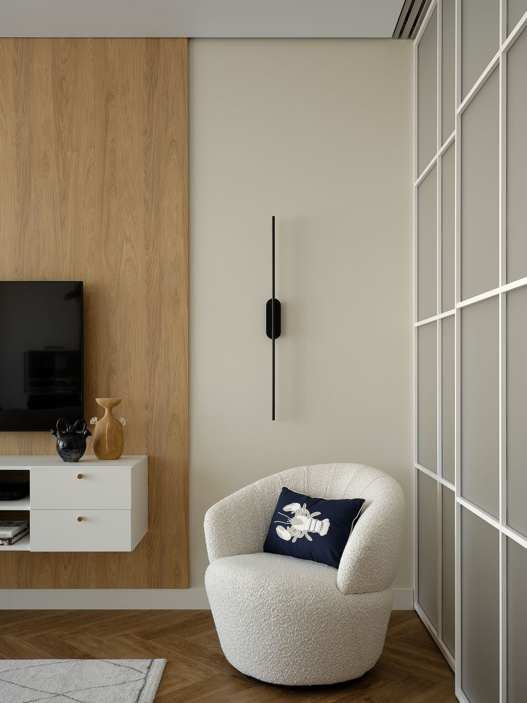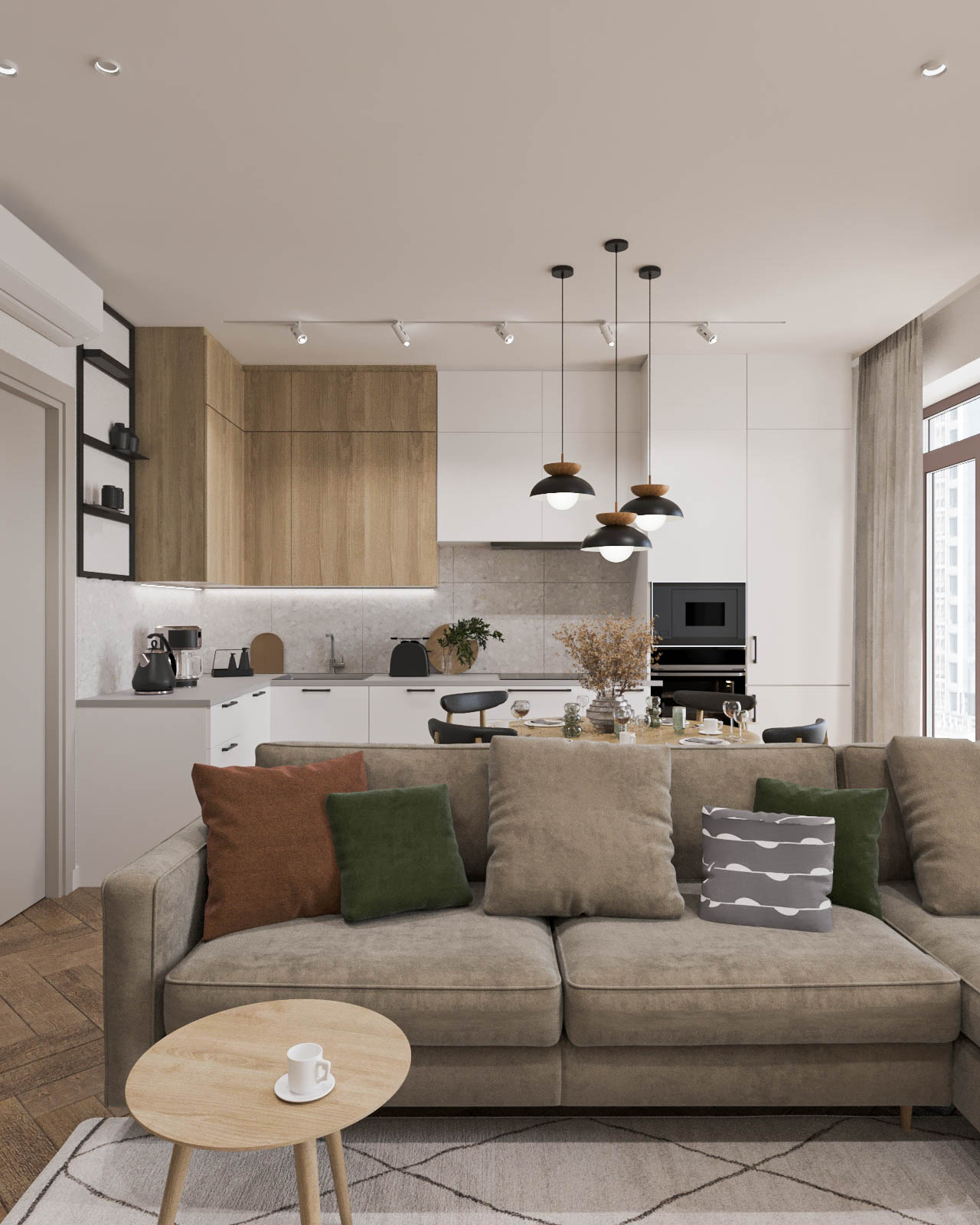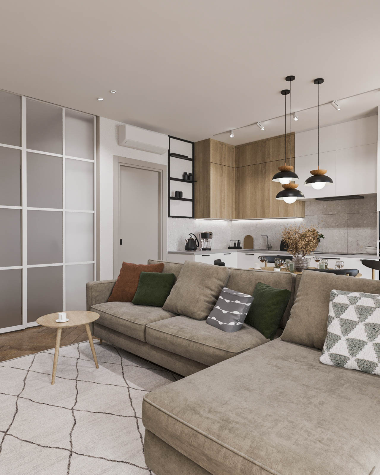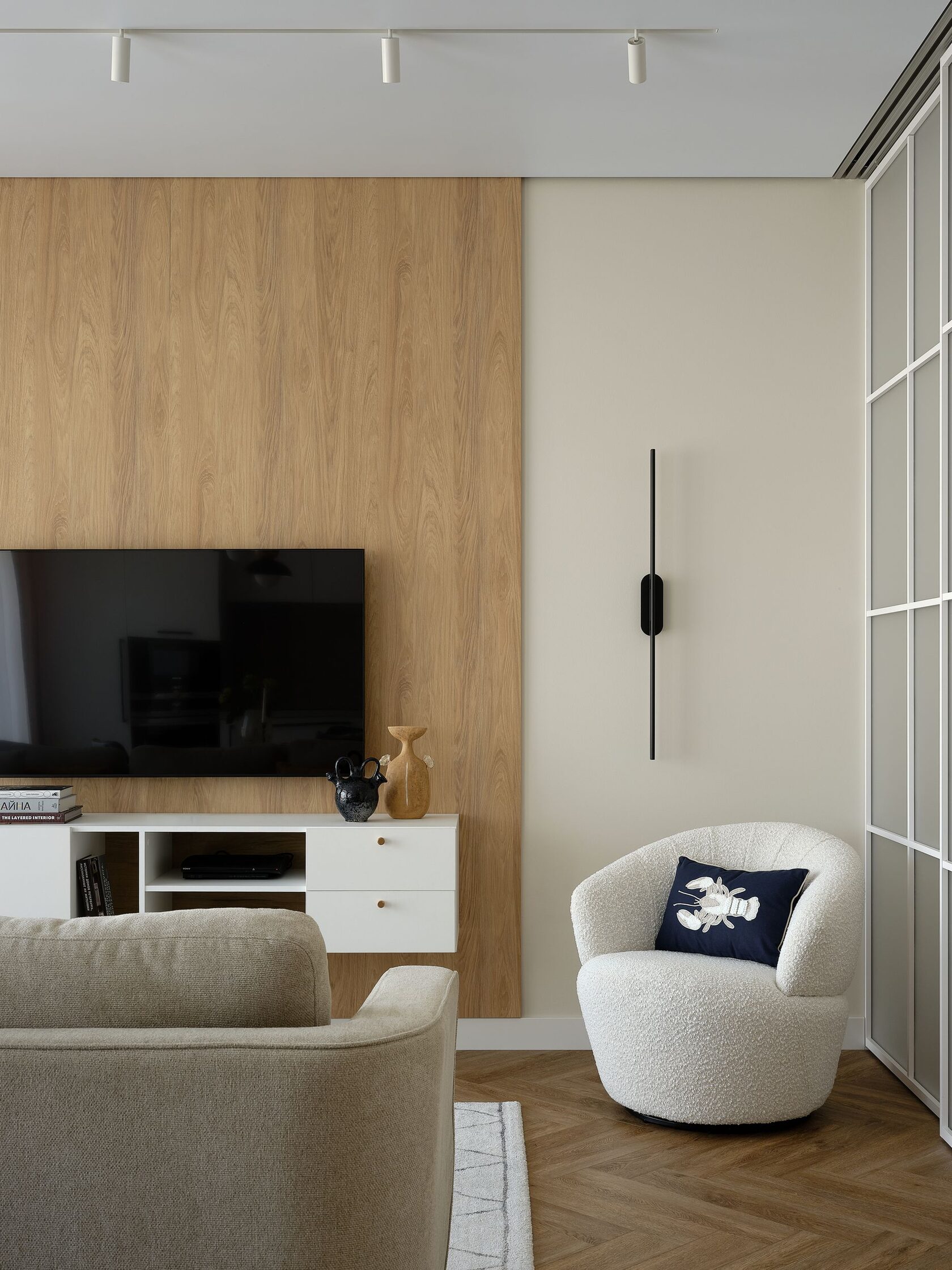 В целом интерьер решён в мягкой скандинавской палитре с песочными оттенками, где органично сочетаются уютная эстетика и современные практичные элементы.