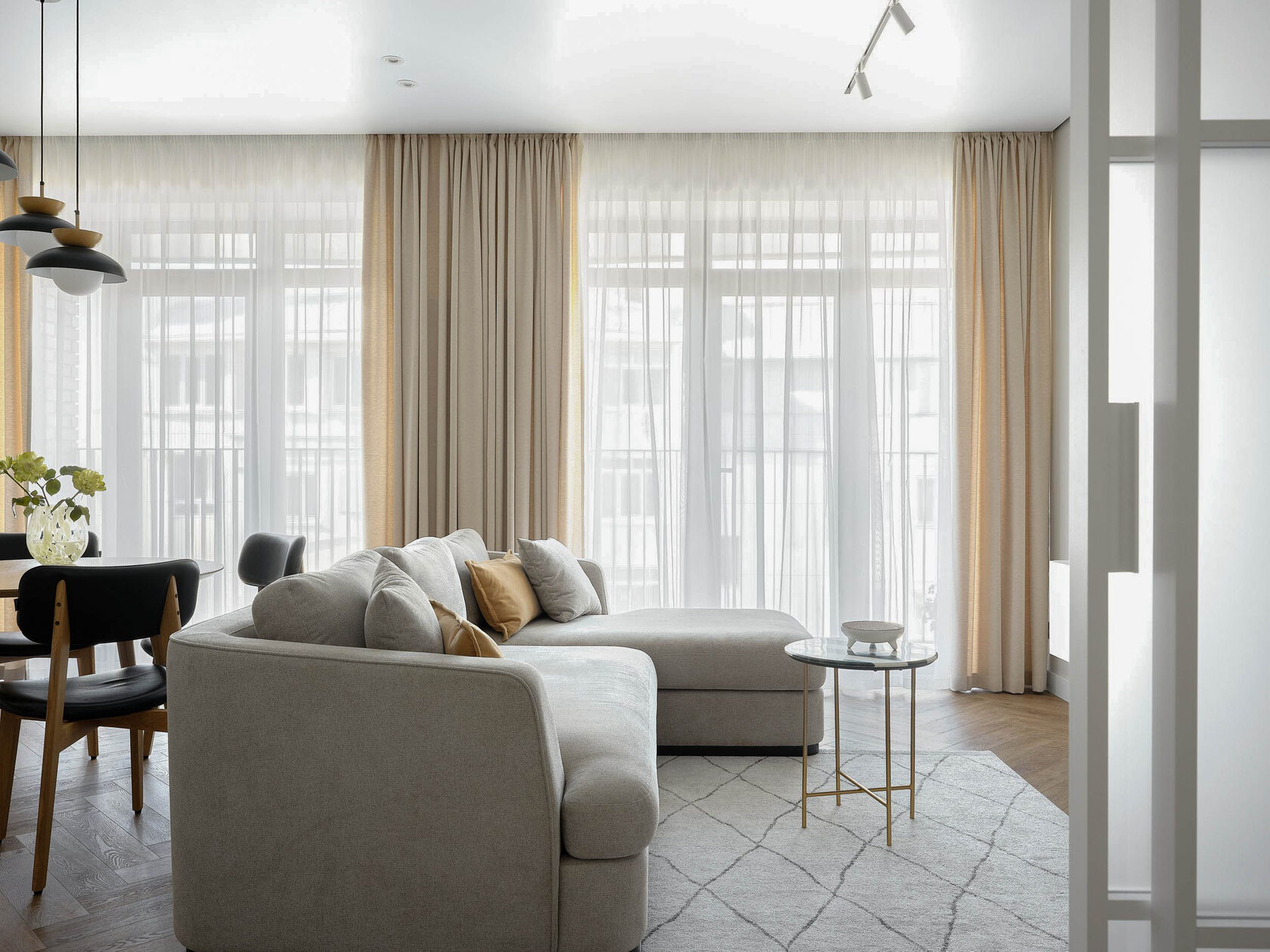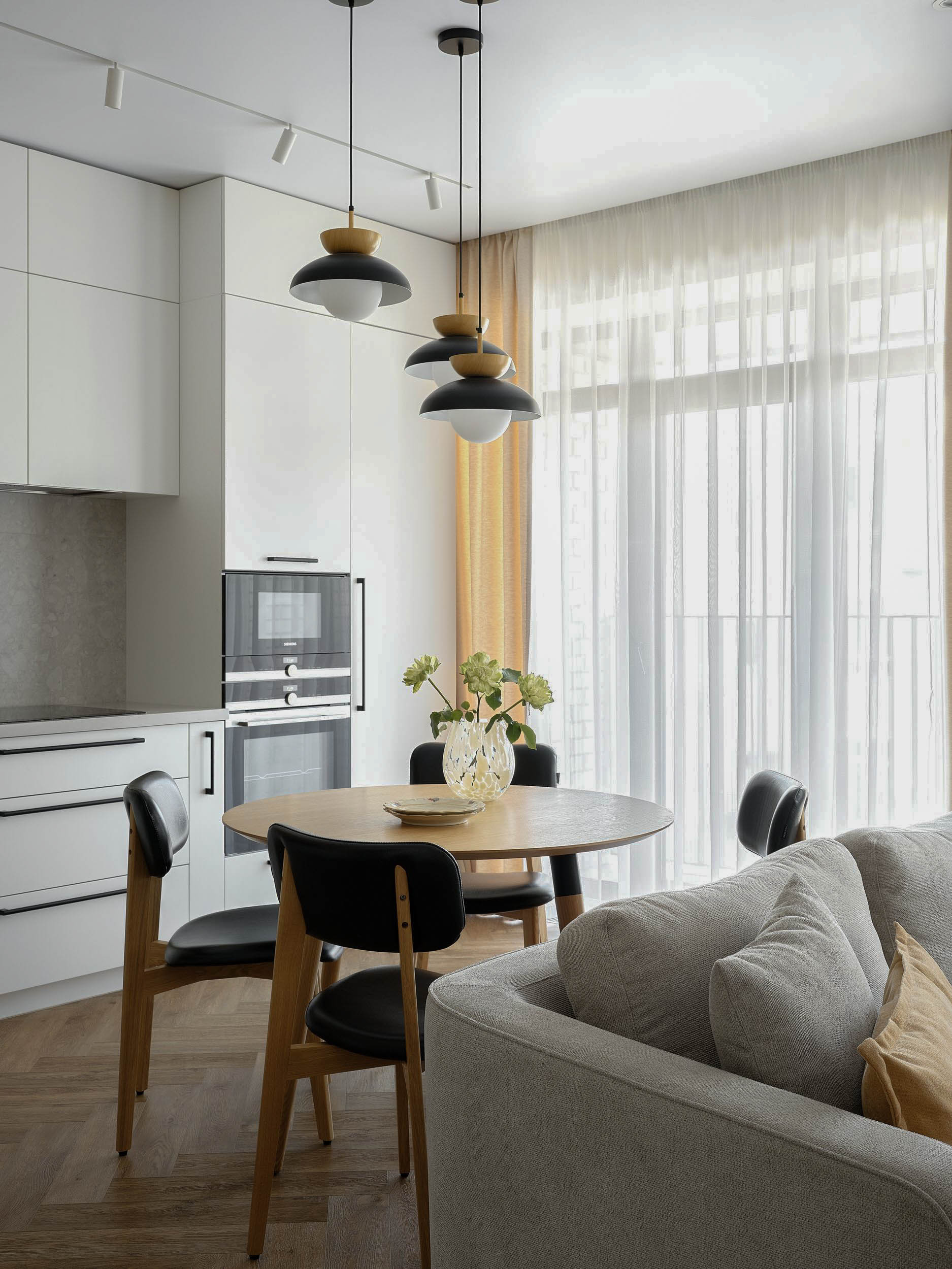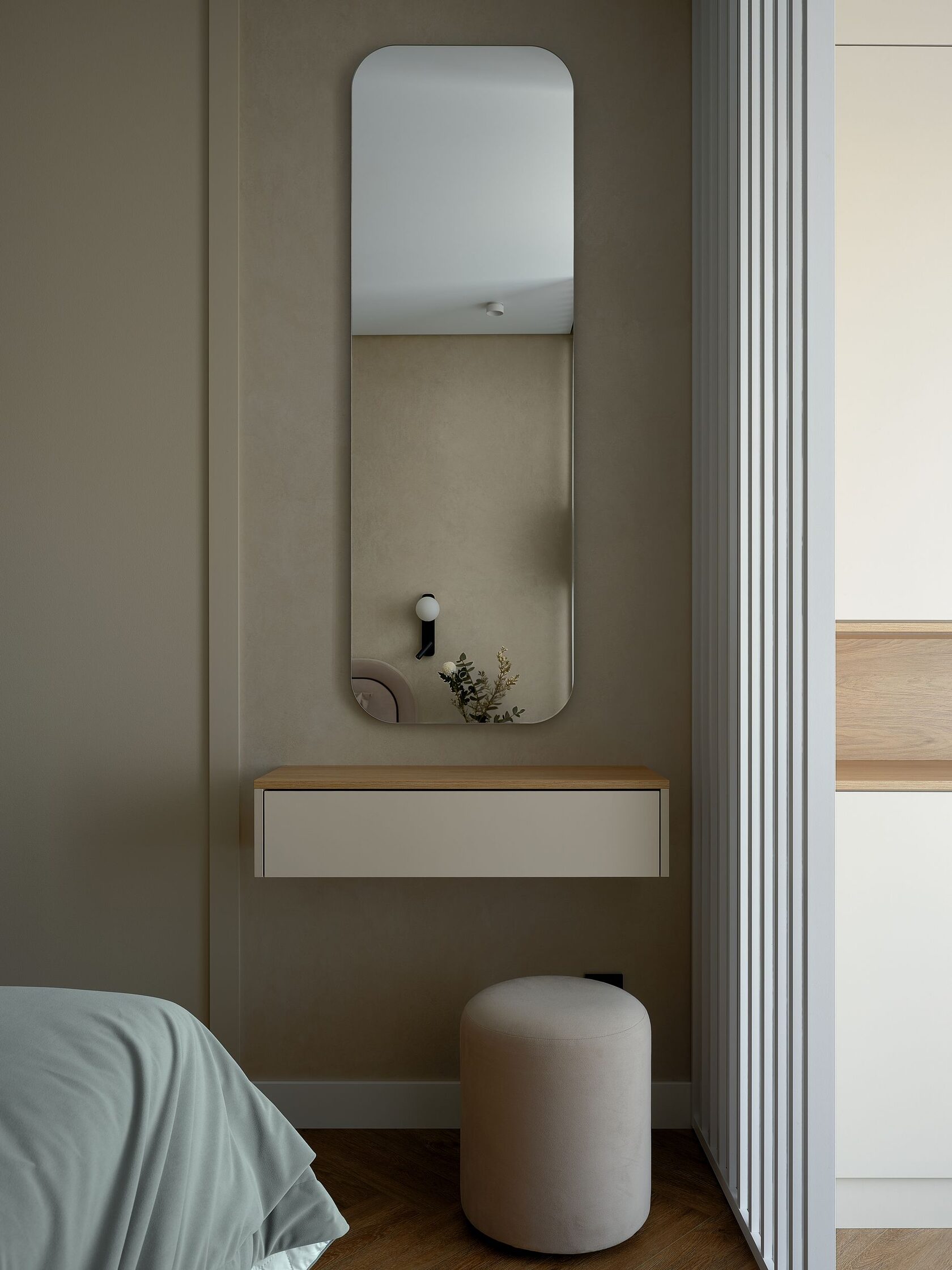 В целом интерьер решён в мягкой скандинавской палитре с песочными оттенками, где органично сочетаются уютная эстетика и современные практичные элементы.