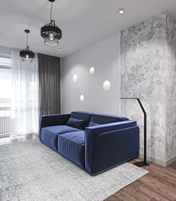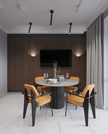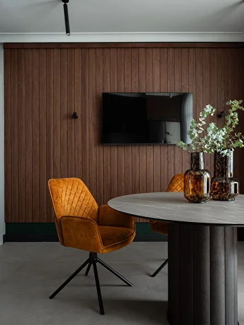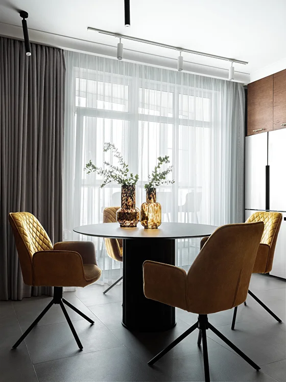 Простора и уюта удалось достичь благодаря продуманной меблировке: большой модульный диван в гостиной и удобные кресла на кухне с круглым столом из камня. Их соседство с рельефными панелями из шпона создает интересный контраст фактур.