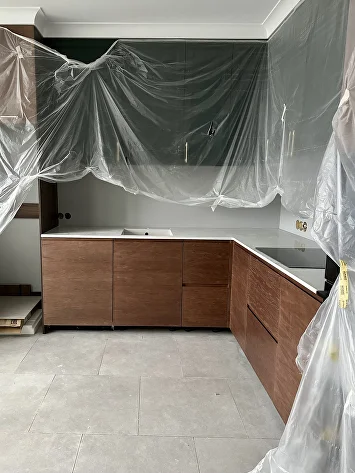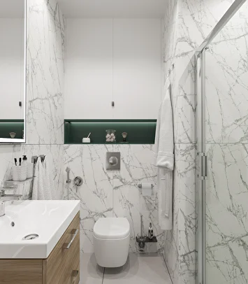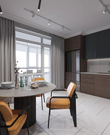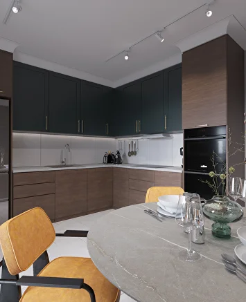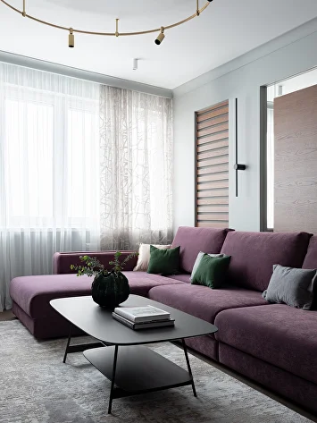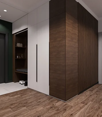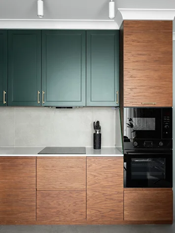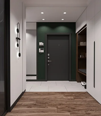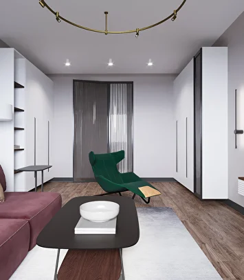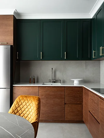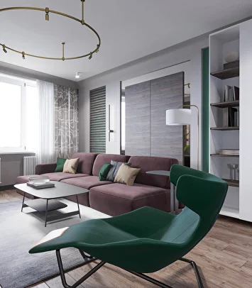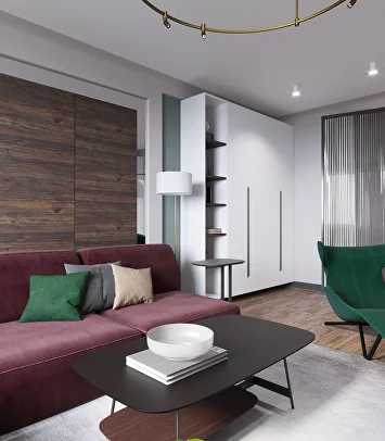Изначально проект был выдержан в нейтральной гамме, но смелое предложение заказчиков добавить насыщенный зеленый цвет стало ключевым моментом. К нему идеально подобрались глубокий бордовый и теплый горчичный — так родилась гармоничная палитра.