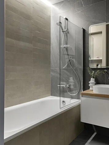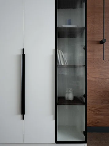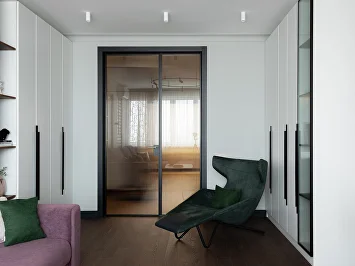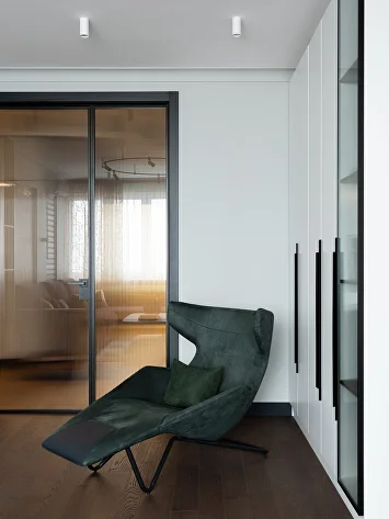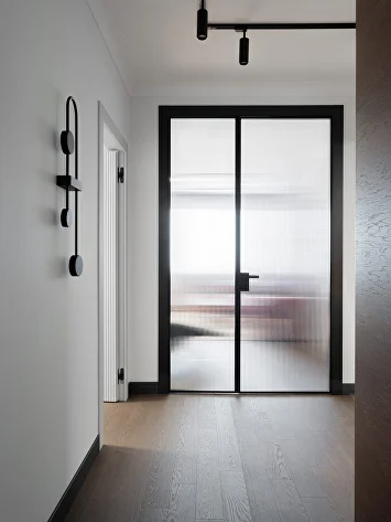 Перепланировка в этой квартире была минимальной: мы сохранили изолированные комнаты, усилив их достоинства. Главным изменением стала высокая стеклянная дверь в гостиную, добавившая интерьеру парадности и простора.