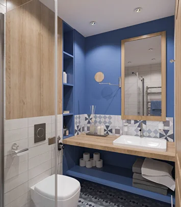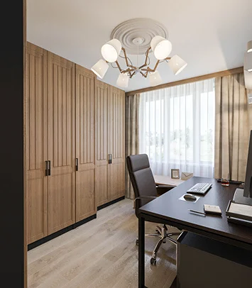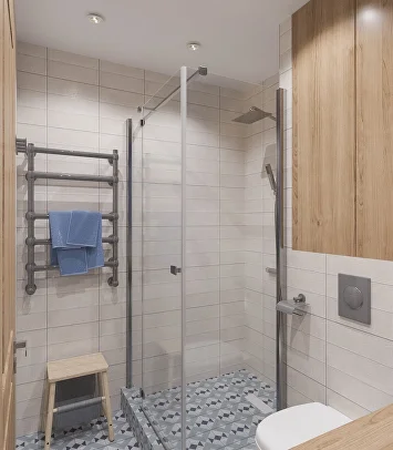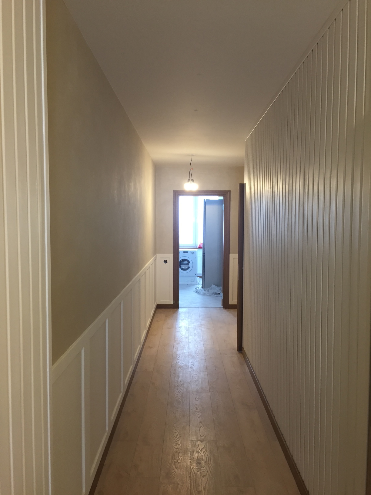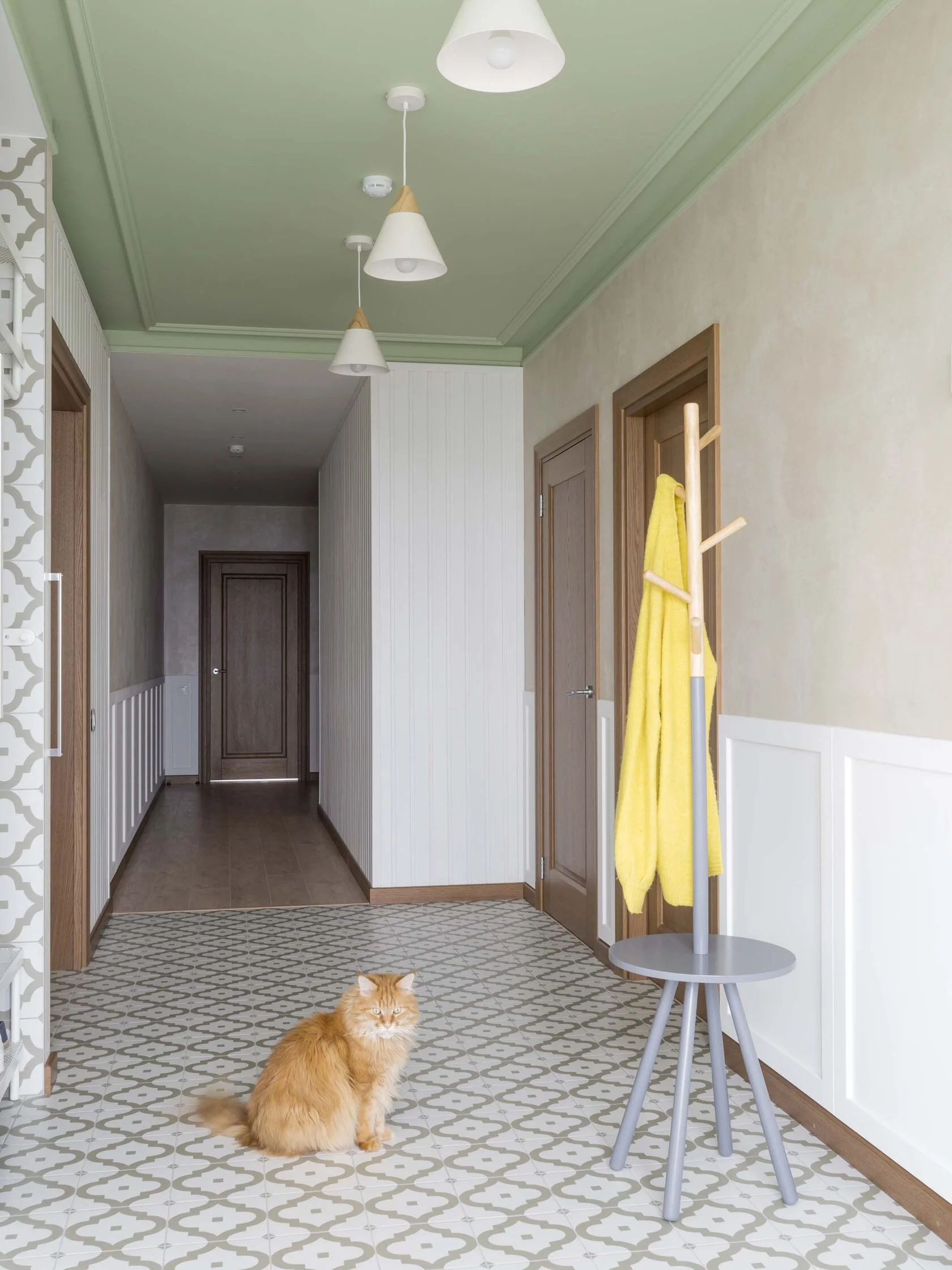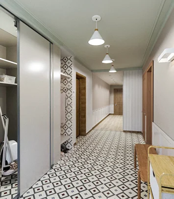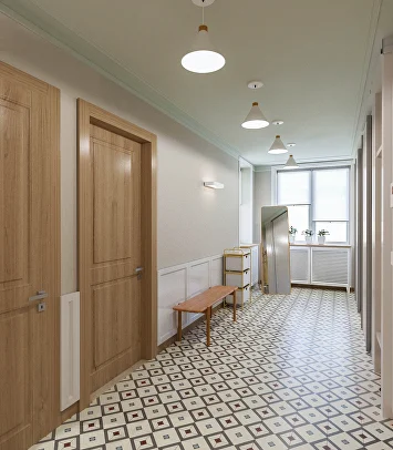 При этом мы не забыли о практичности. В прихожей и коридоре выделена специальная зона с отделкой из деревянных досок и защитных панелей. Их легко мыть и протирать — можно не бояться испачкать стены, даже если они под покраску.