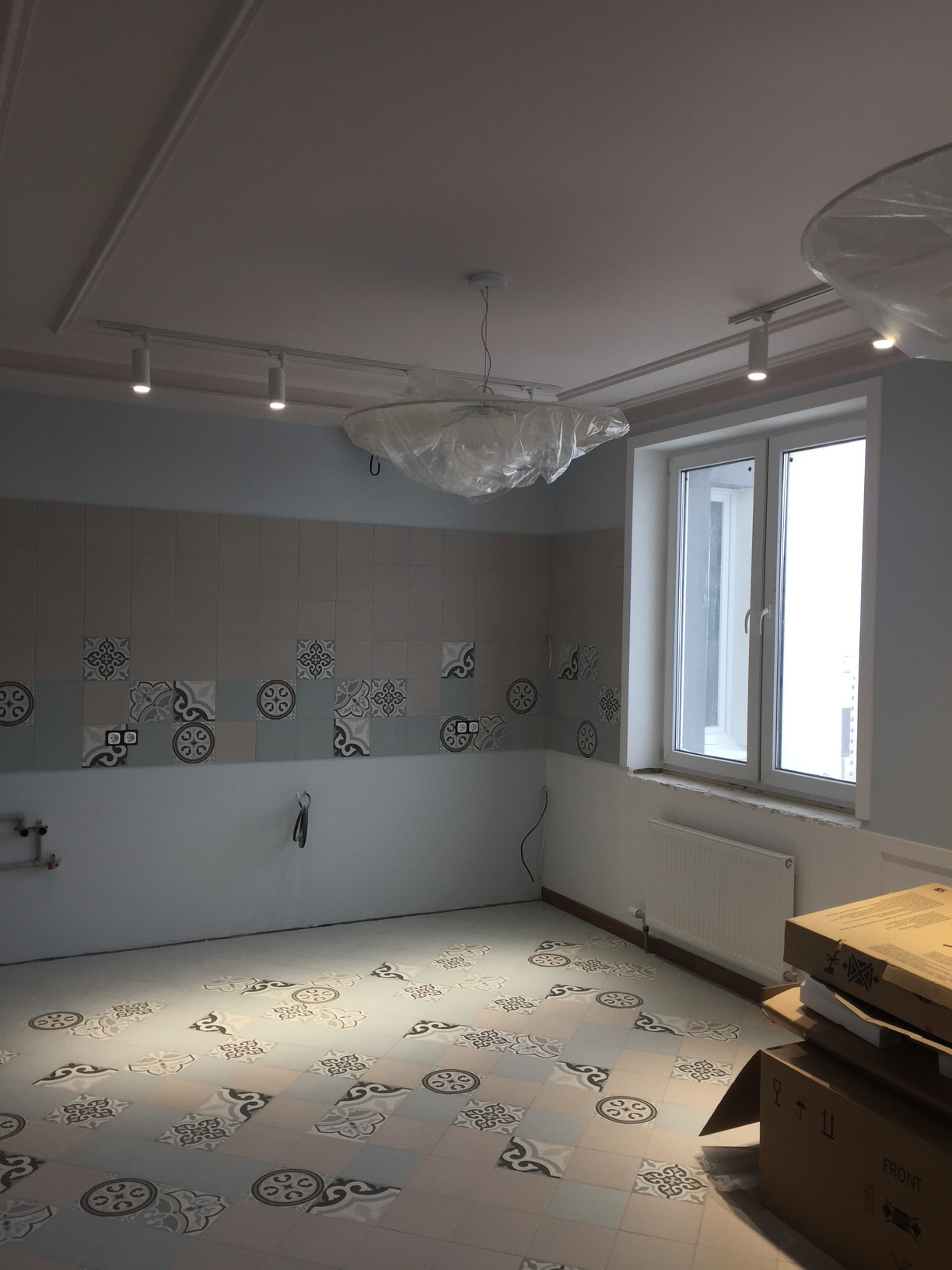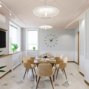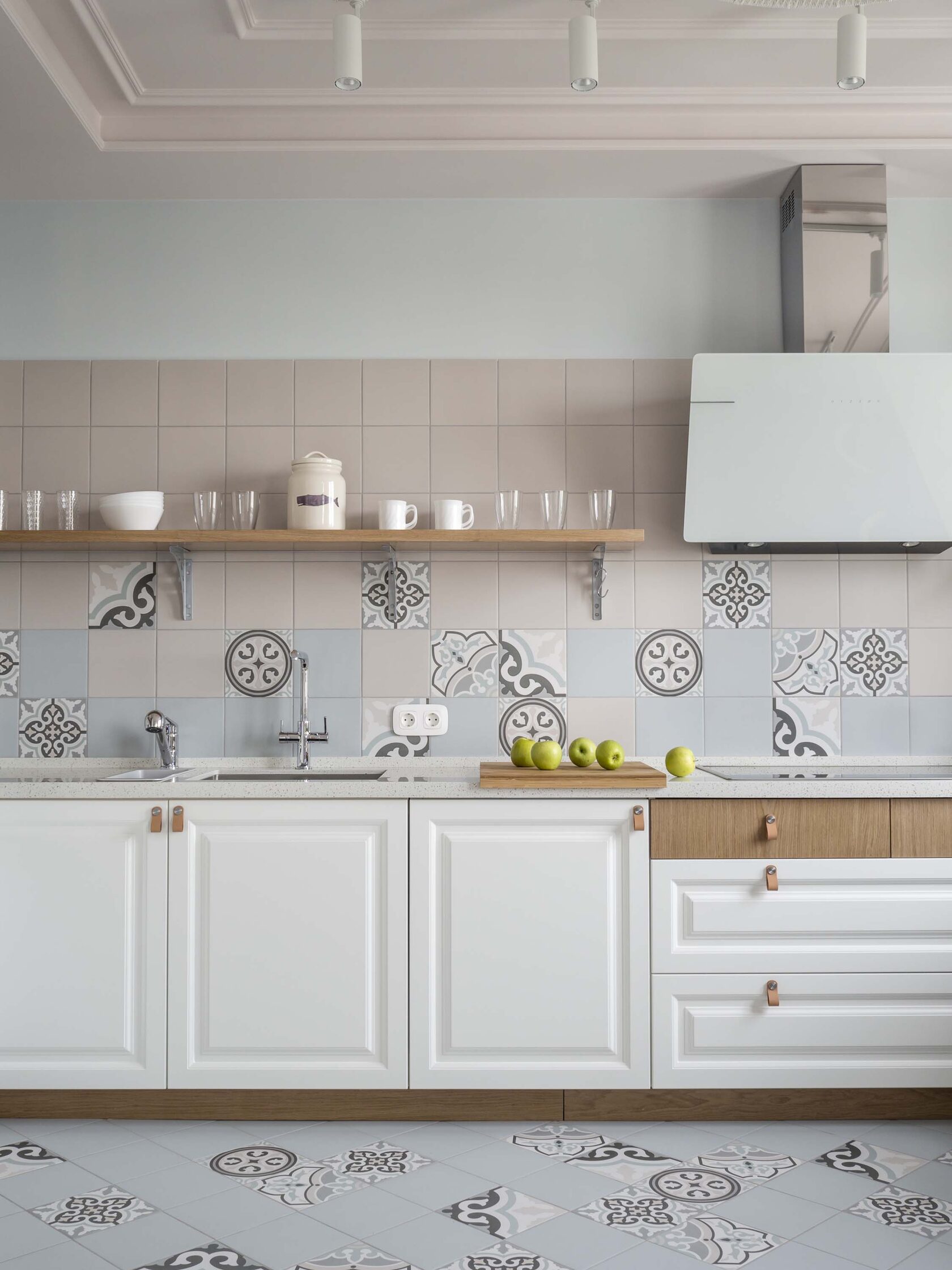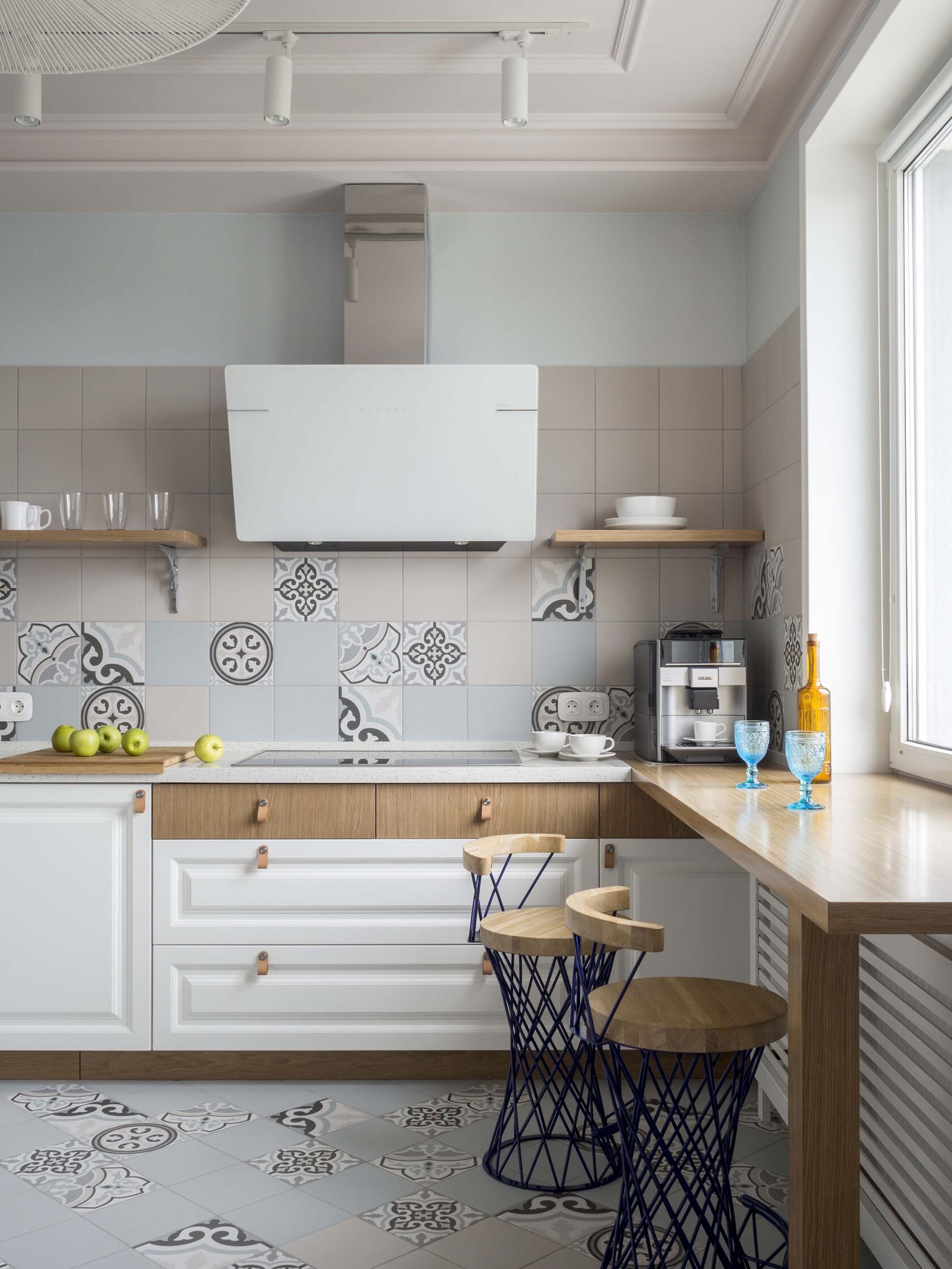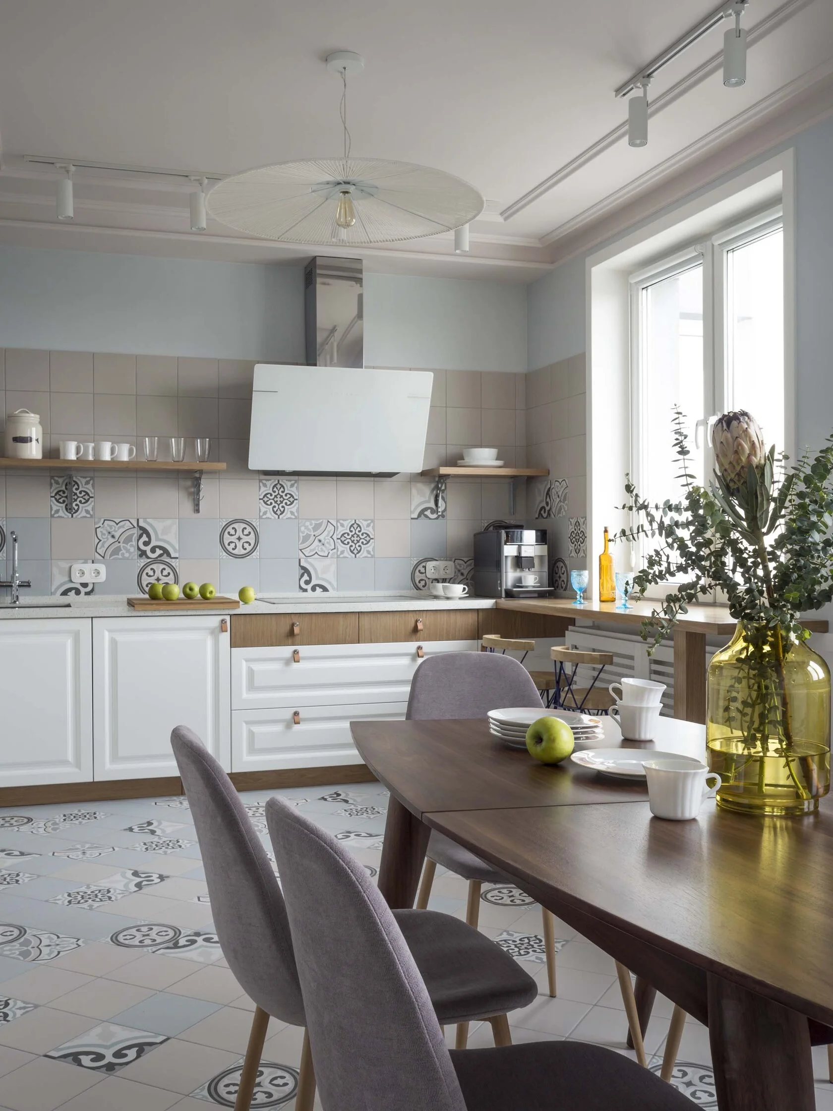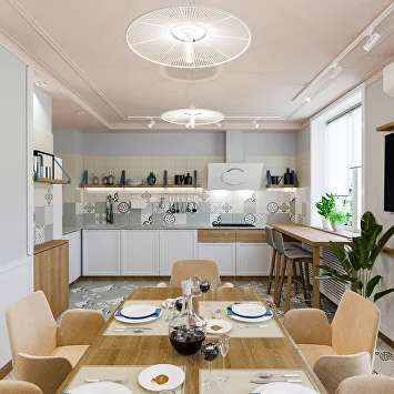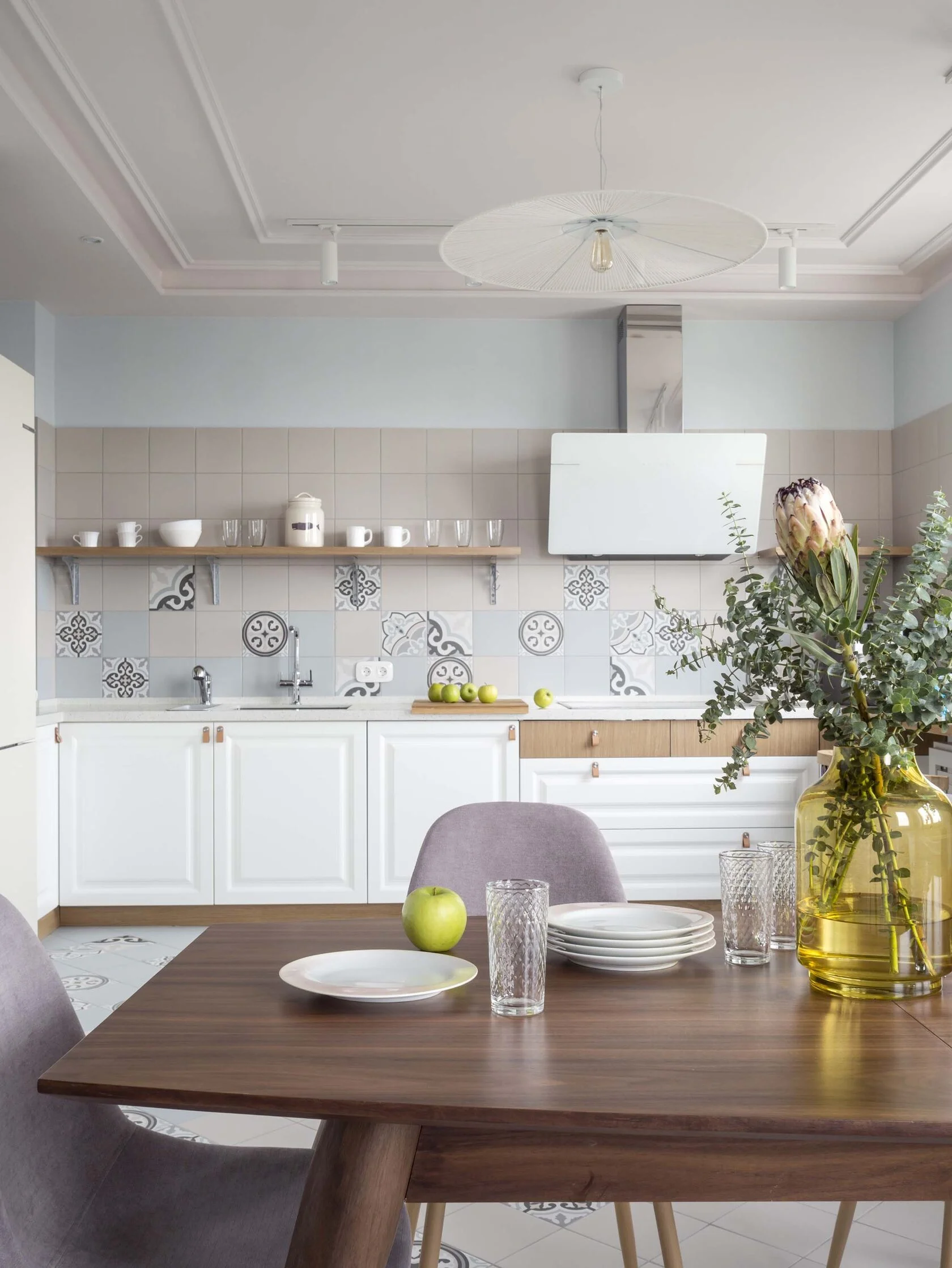 Любовь заказчиков к Италии вдохновила нас на создание яркой кухонной зоны: плитка с характерным рисунком на полу и светильники в виде пляжных зонтиков привносят атмосферу dolce vita.
