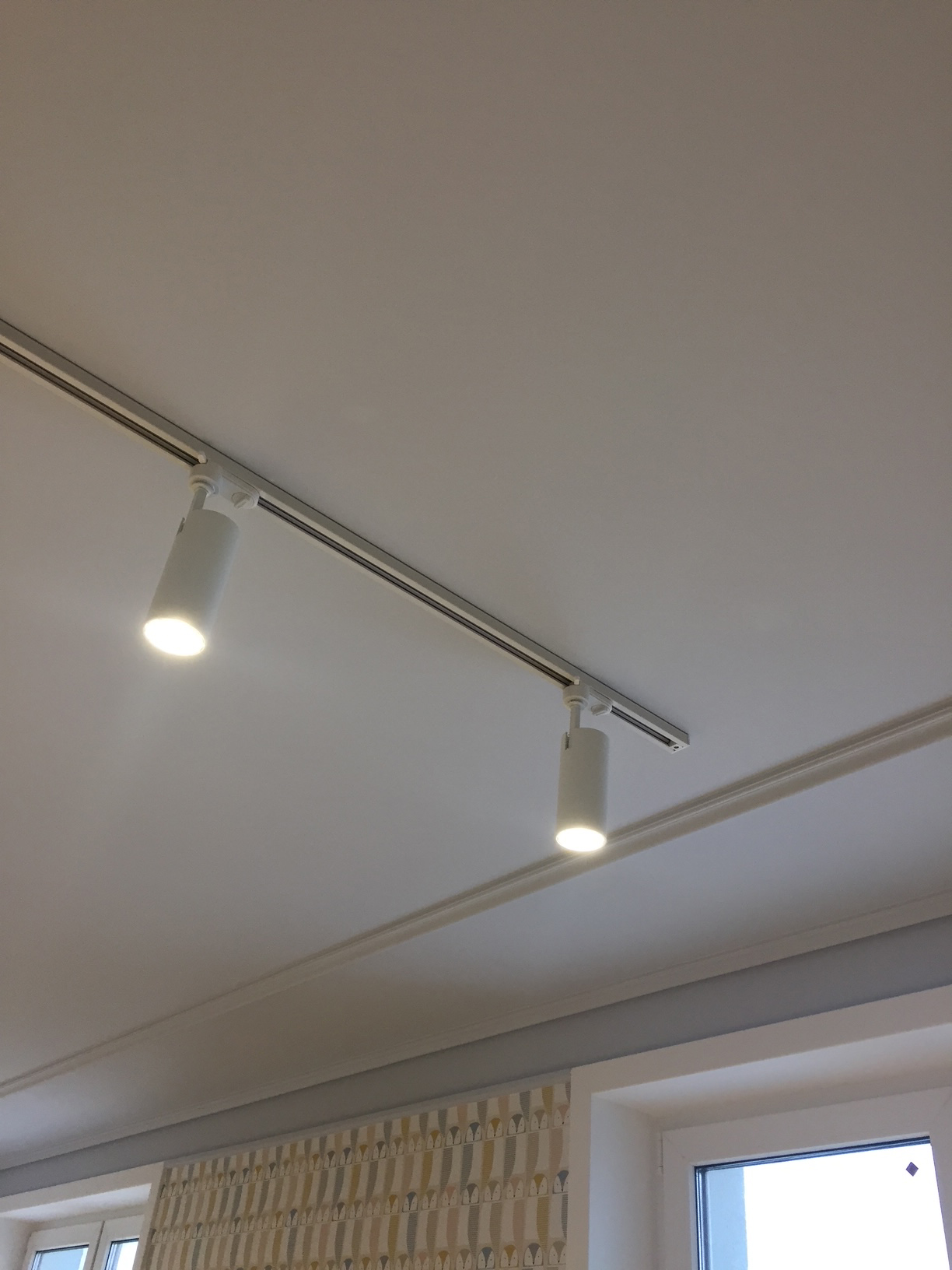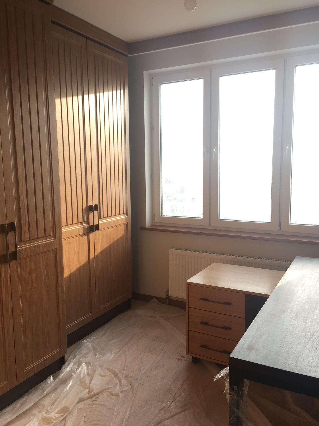 Окна мы решили не закрывать тяжёлыми занавесками — только лаконичные рулонные шторы на рамах. Поэтому квартира ощущается одновременно очень просторной и уютной.