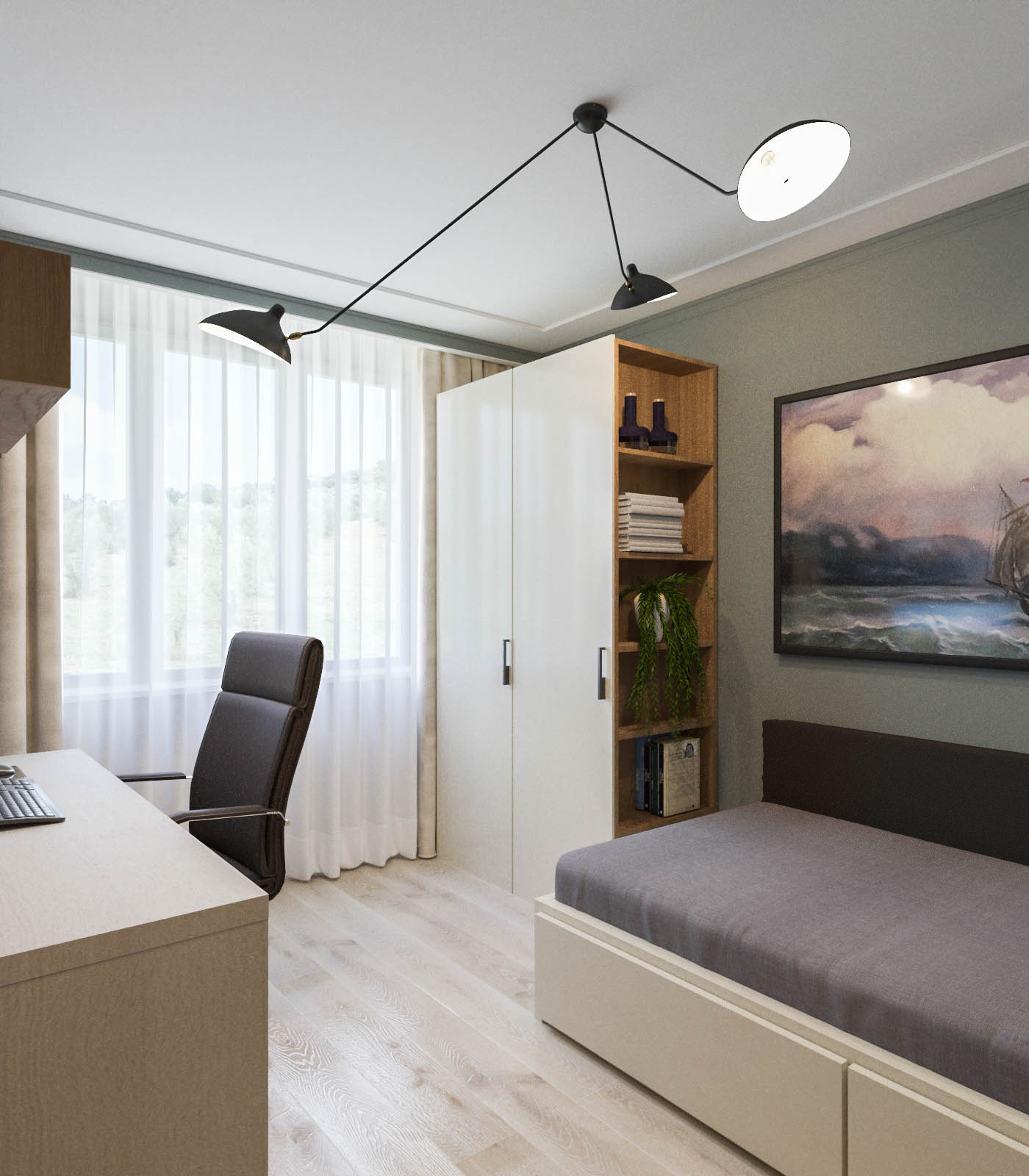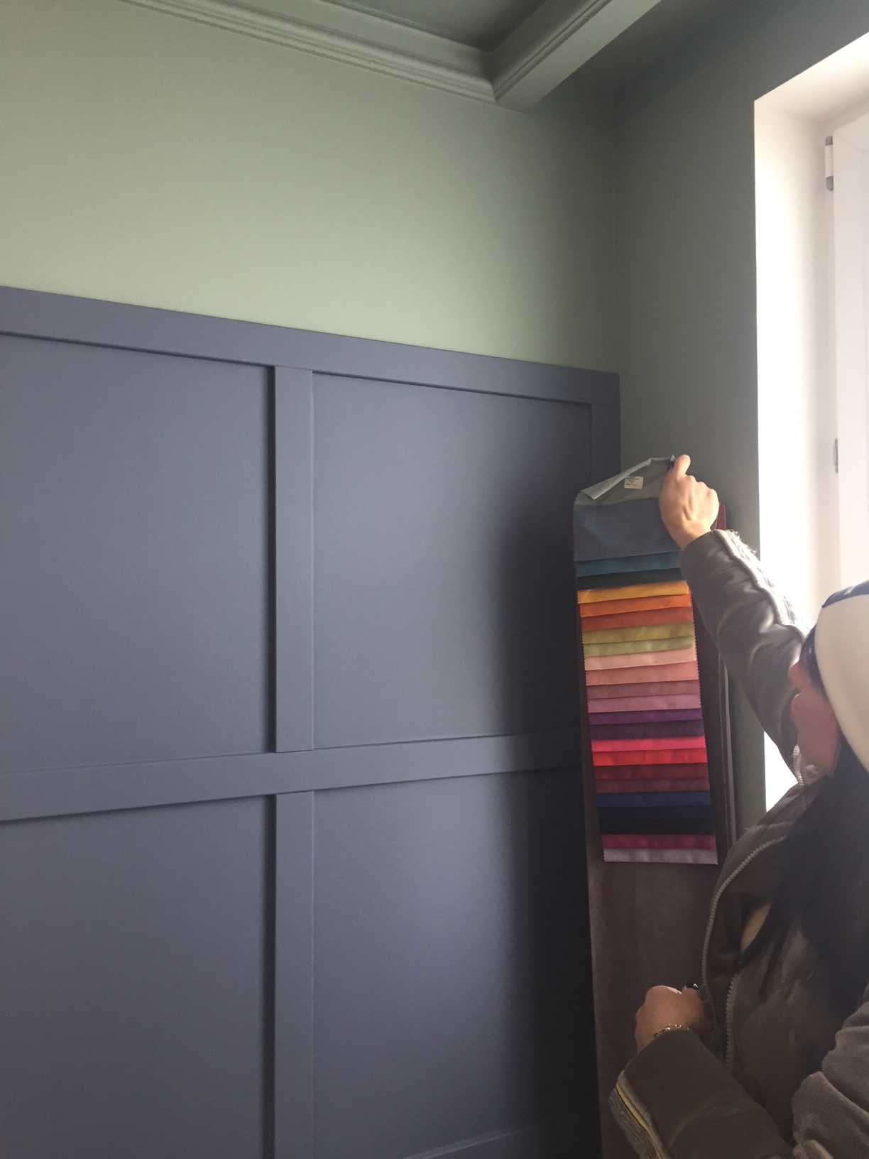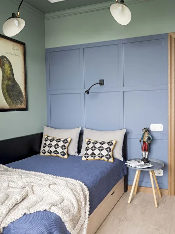 Секрет — в смелых цветовых решениях и отказе от скучных белых потолков. В каждом помещении мы использовали природные оттенки сложной, многогранной гаммы. Это не кричащие открытые цвета, а припылённые, размытые, глубокие тона, которые по-разному раскрываются при дневном свете. Благо, в квартире много окон, и свет — наш главный соавтор.