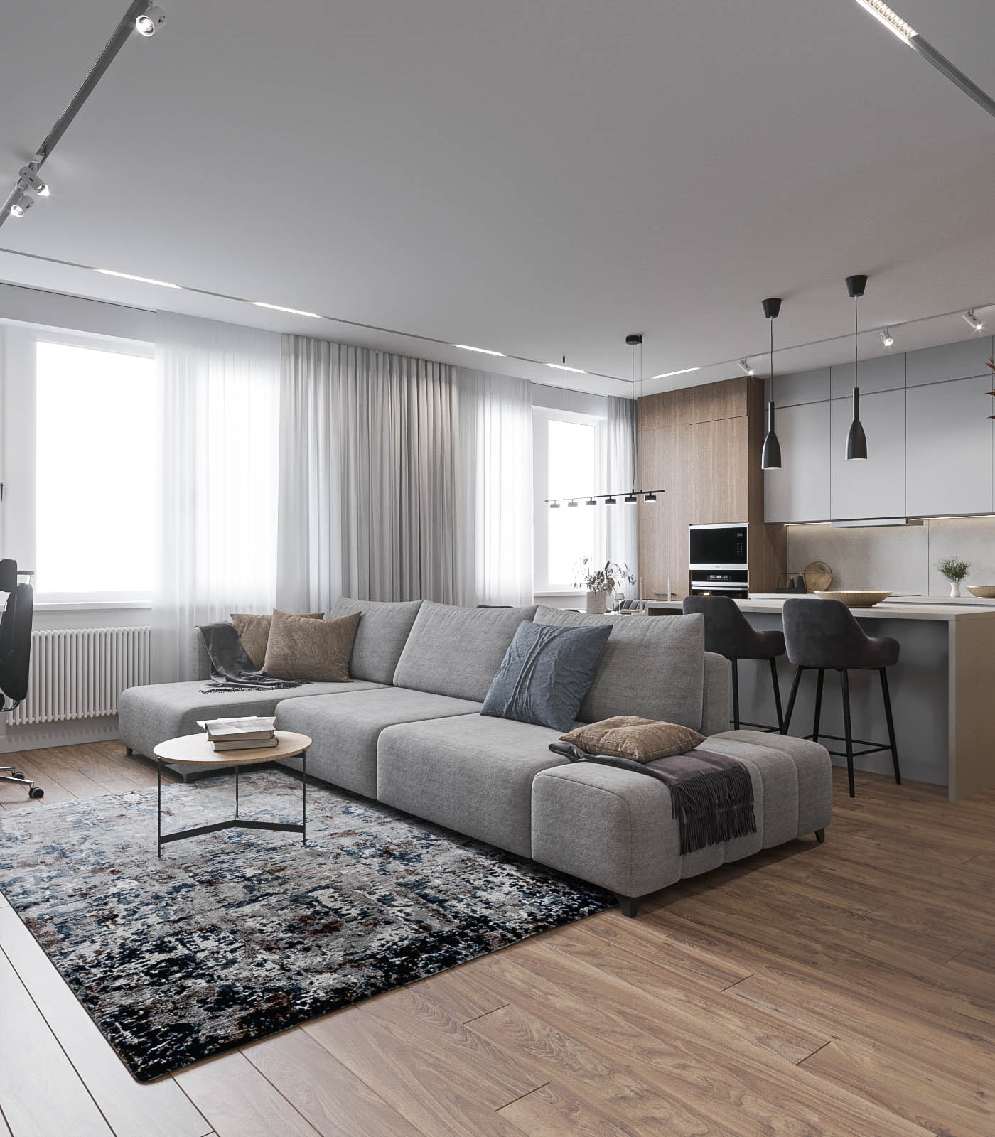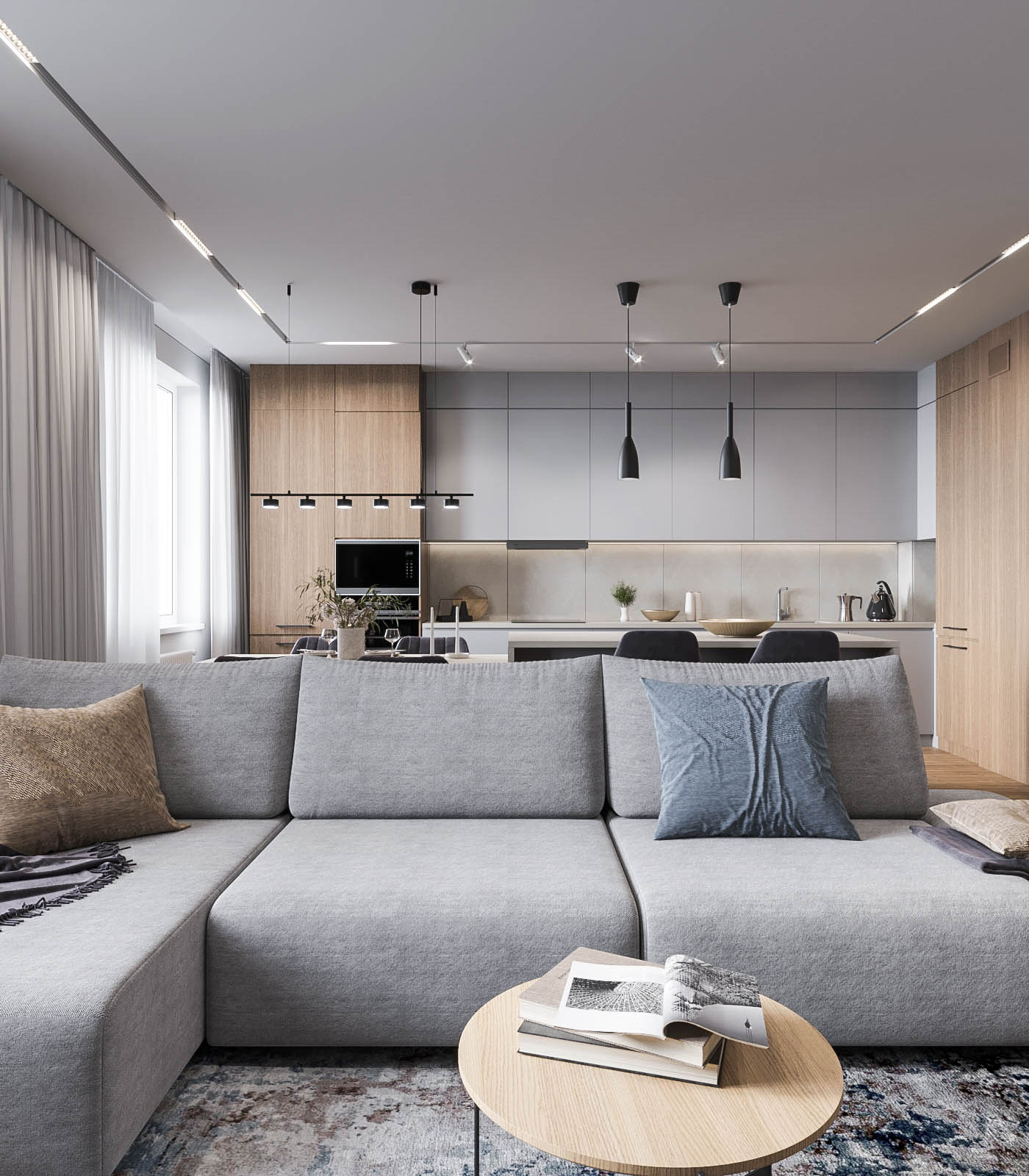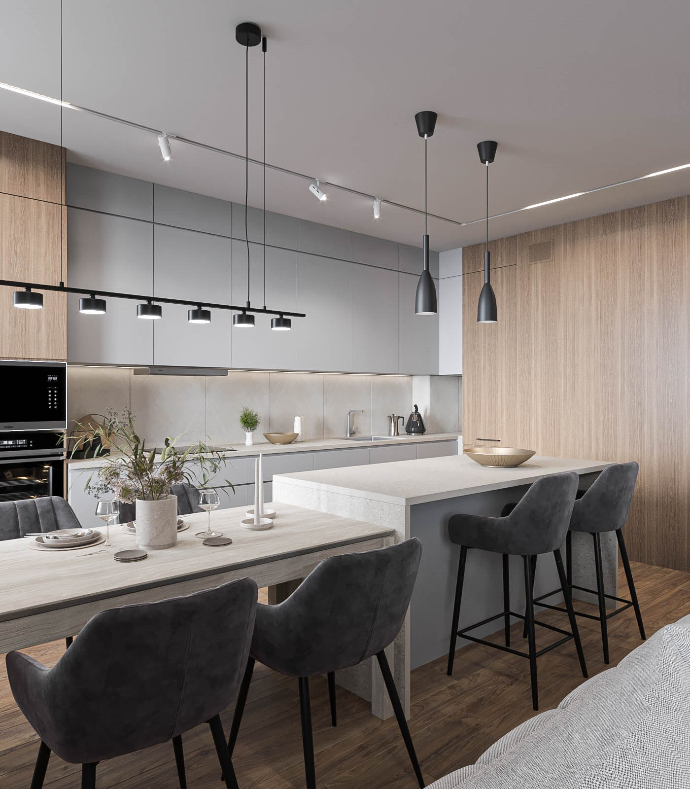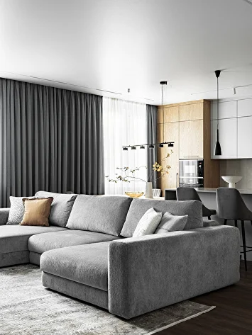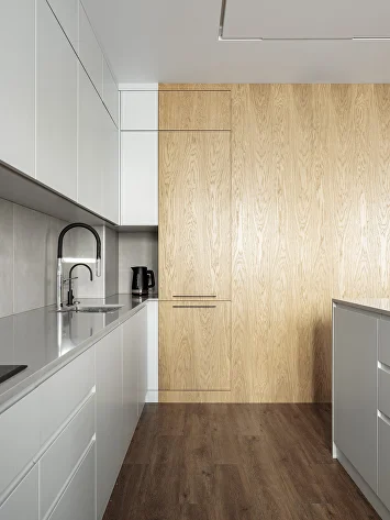 Холодную серую гамму сбалансировал теплый шпон на кухне. Глубину и характер интерьеру придали черный металл (светильники, фурнитура), а также рельефные панели и декоративная штукатурка.