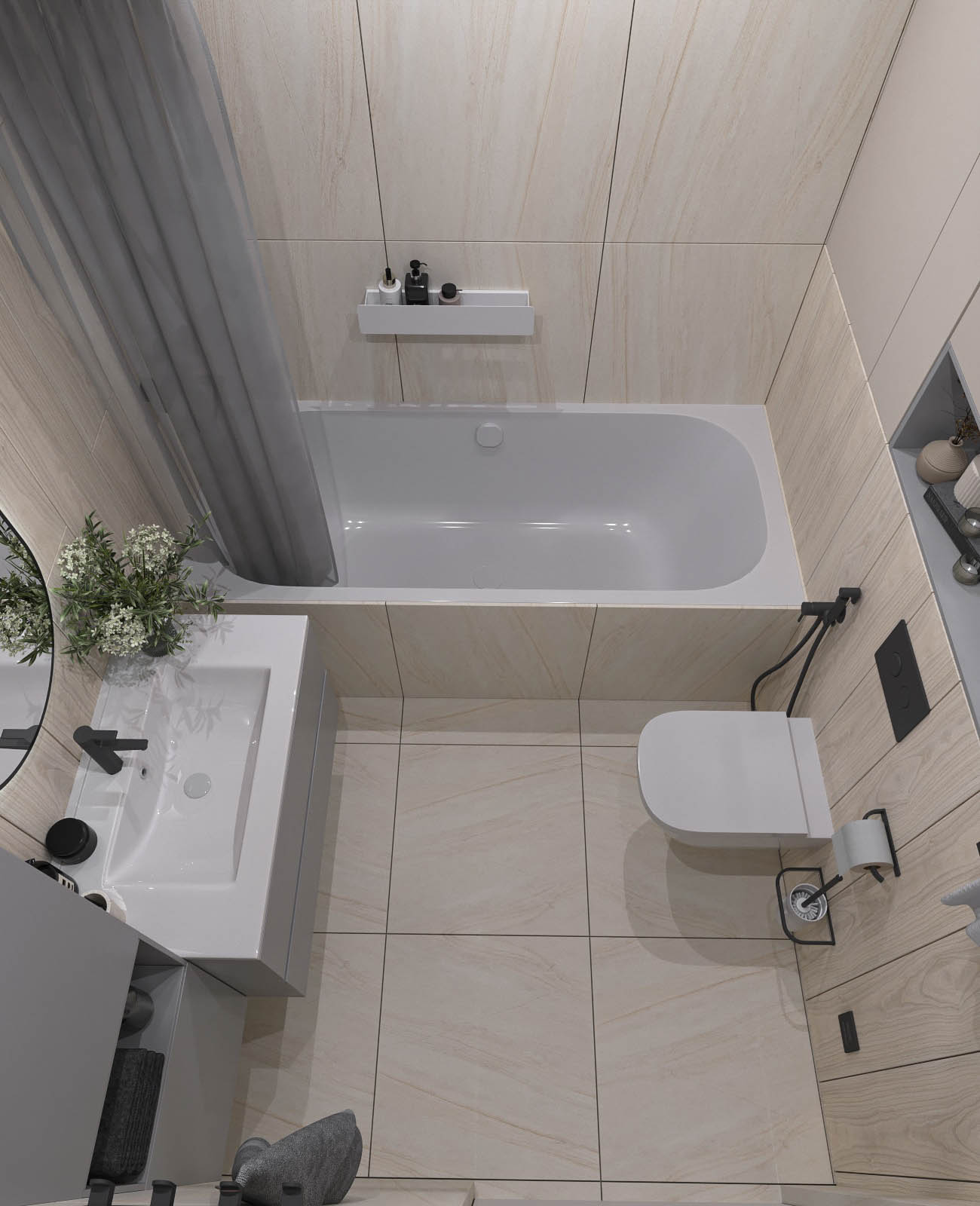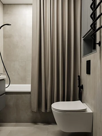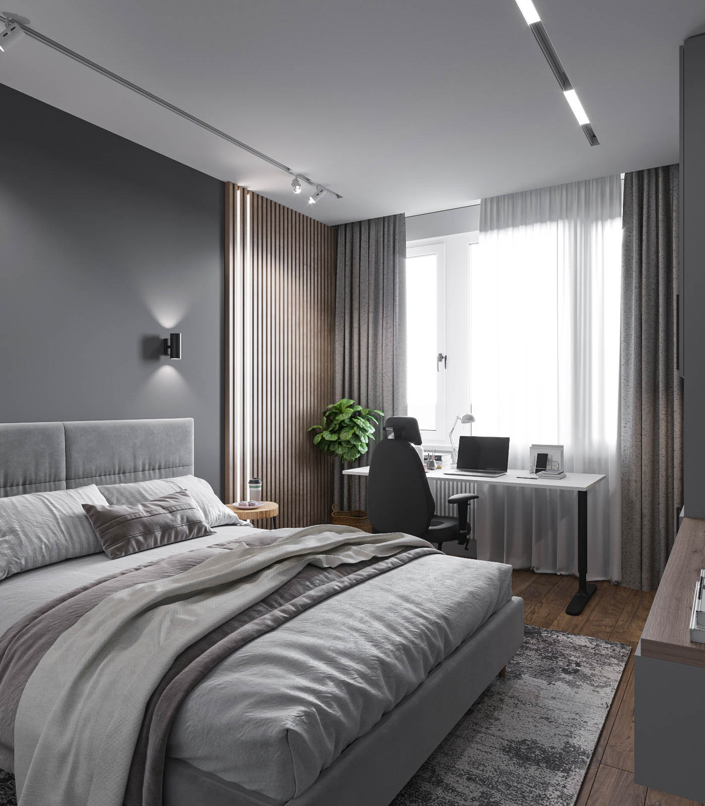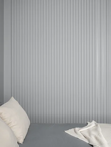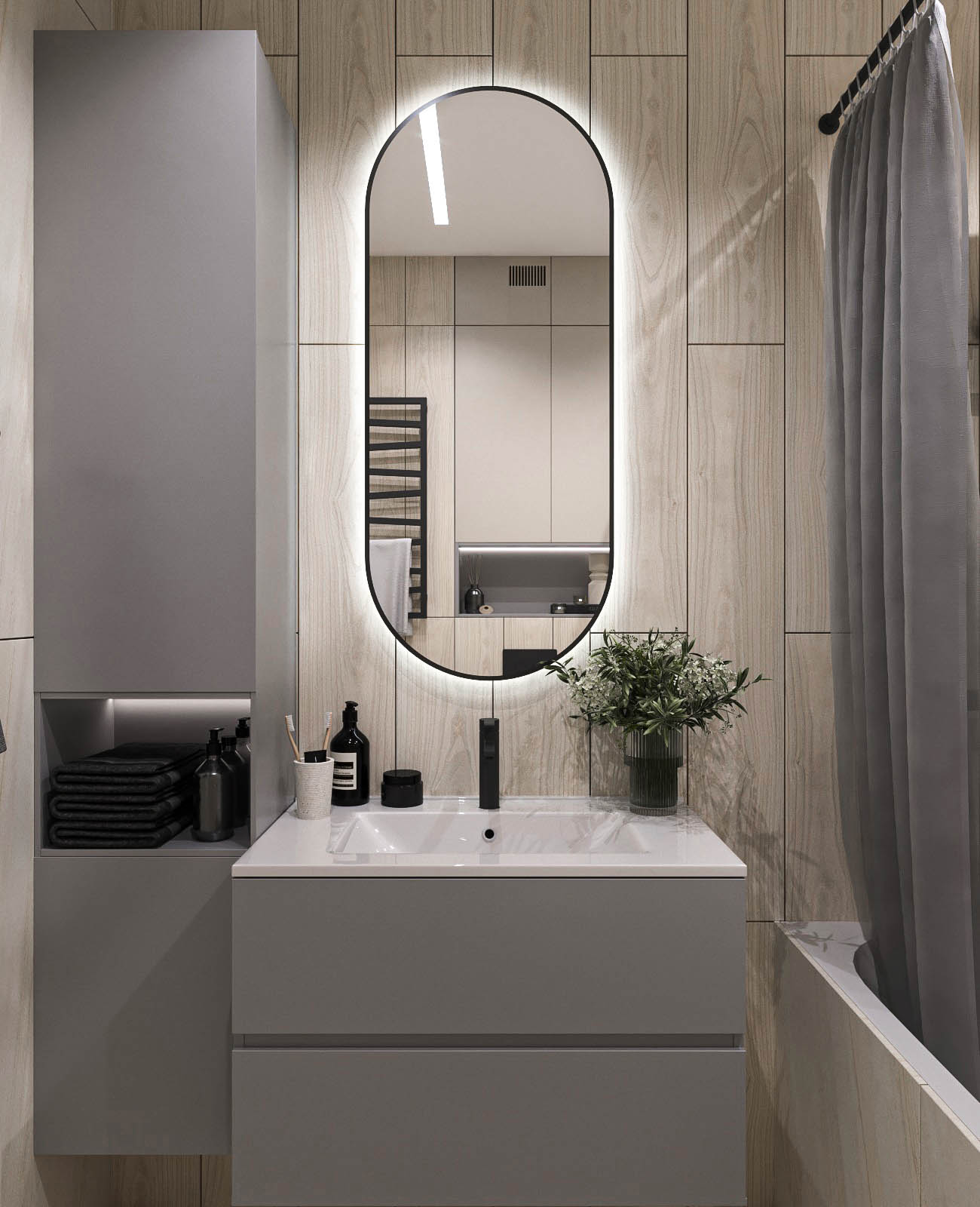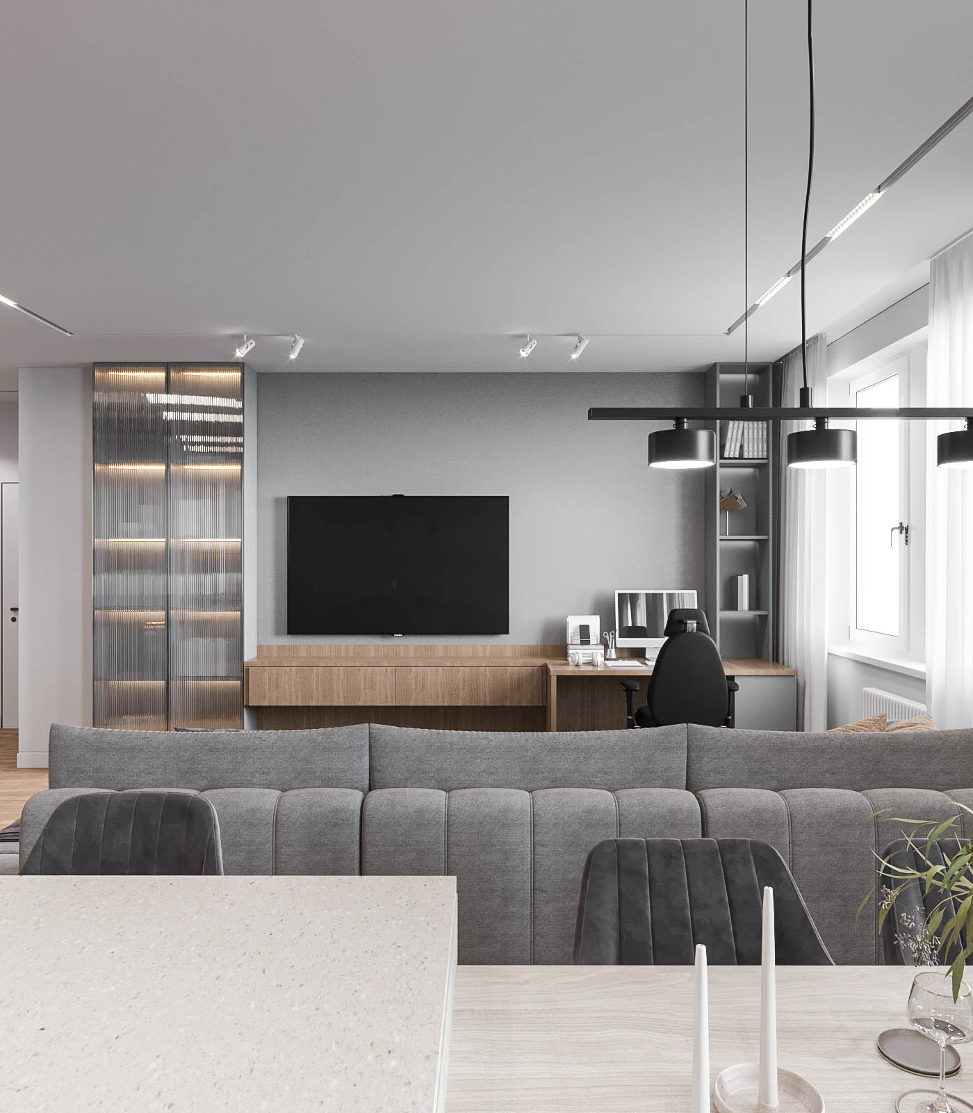 Холодную серую гамму сбалансировал теплый шпон на кухне. Глубину и характер интерьеру придали черный металл (светильники, фурнитура), а также рельефные панели и декоративная штукатурка.