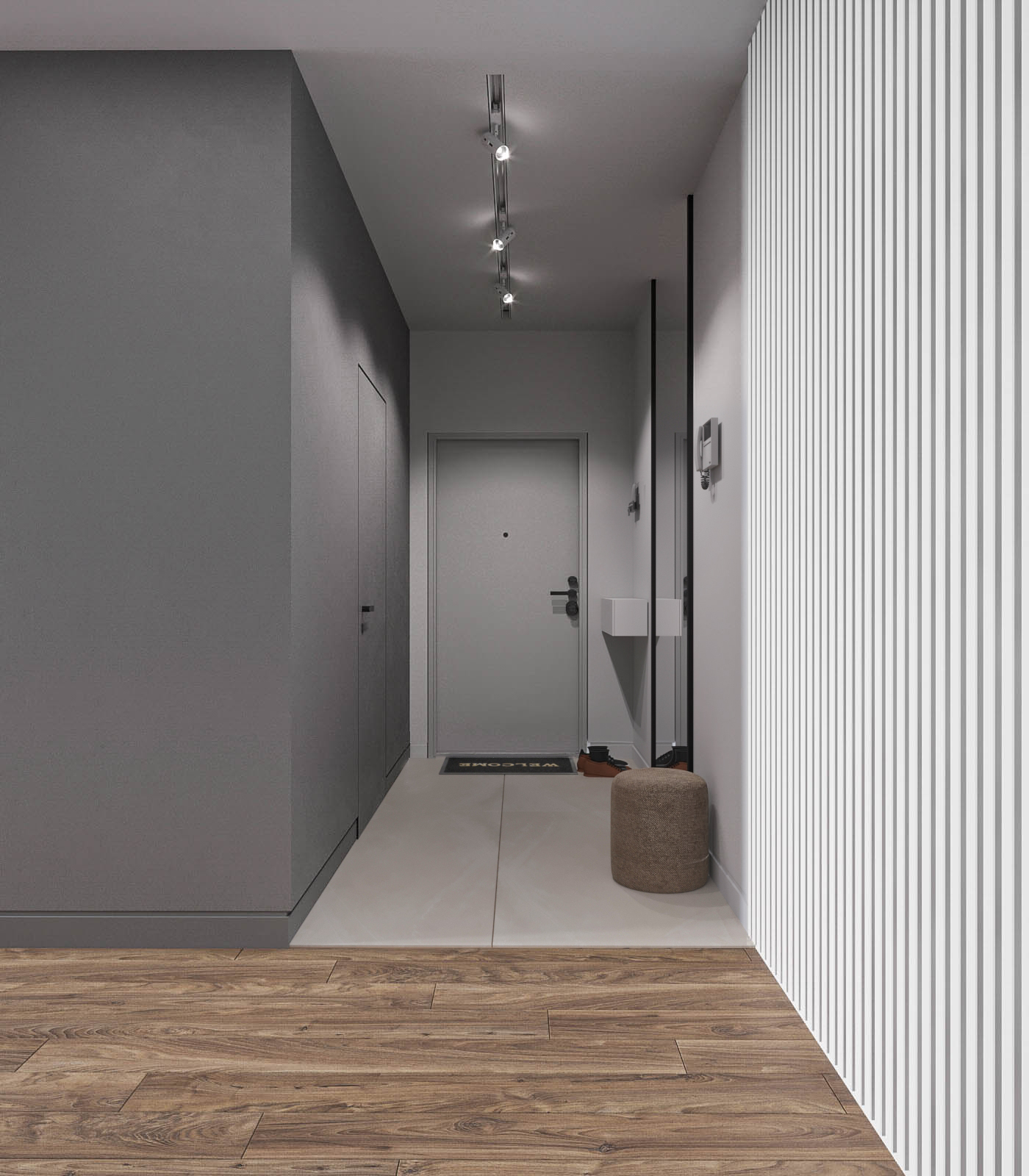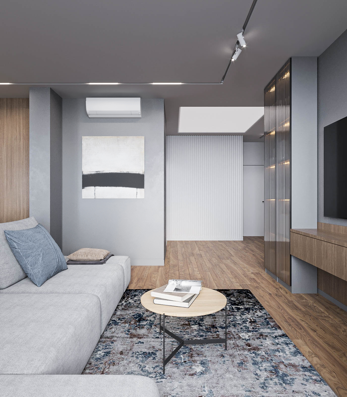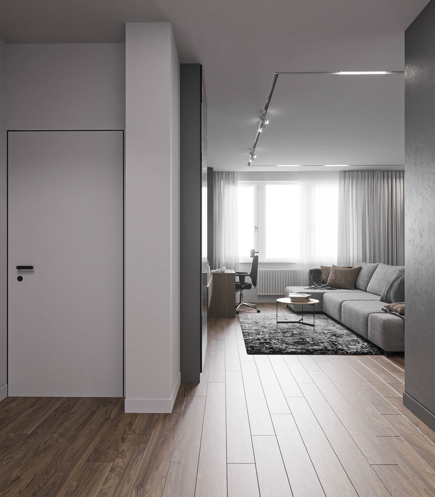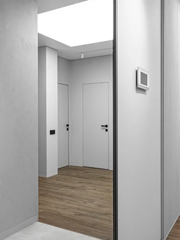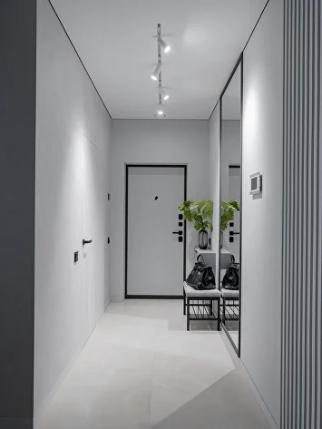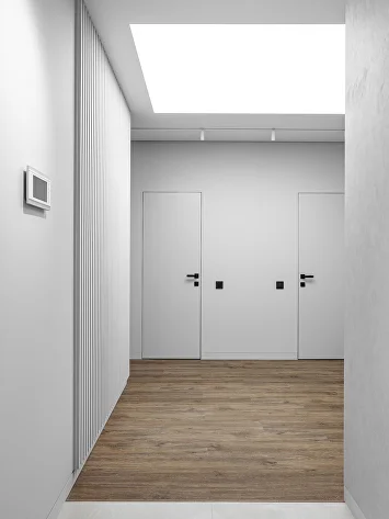 Световой потолок в коридоре стал ключевым элементом, подчеркивающим эстетику минимализма.